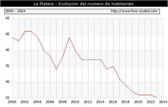 el numero de habitantes en La Platera era de 25, igual numero de habitantes que el en el año 2023. En el grafico siguiente se puede ver cuantos habitantes tiene La Platera a lo largo de los años.