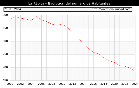 el numero de habitantes en La Rábita era de 685, 13 habitantes menos que el en el año 2023. En el grafico siguiente se puede ver cuantos habitantes tiene La Rábita a lo largo de los años.