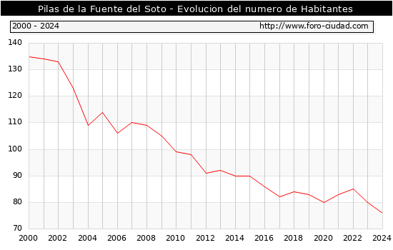 el numero de habitantes en Pilas de la Fuente del Soto era de 76, 4 habitantes menos que el en el año 2023. En el grafico siguiente se puede ver cuantos habitantes tiene Pilas de la Fuente del Soto a lo largo de los años.