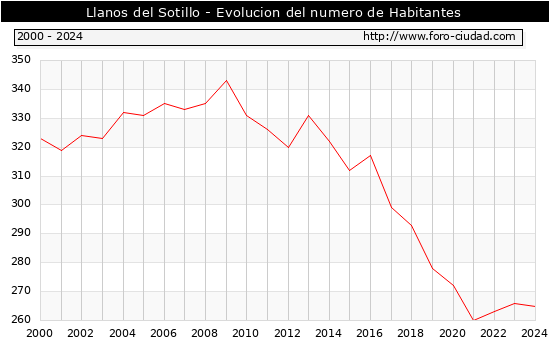el numero de habitantes en Llanos del Sotillo era de 265, 1 habitantes menos que el en el año 2023. En el grafico siguiente se puede ver cuantos habitantes tiene Llanos del Sotillo a lo largo de los años.