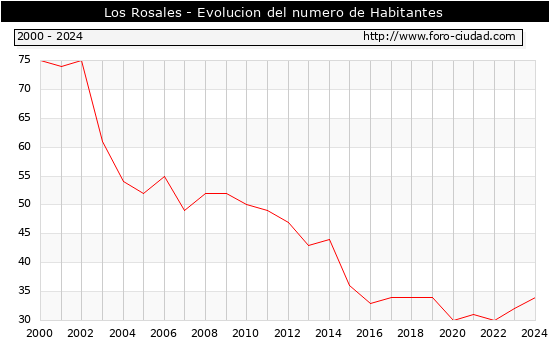 el numero de habitantes en Los Rosales era de 34, 2 habitantes mas que el en el año 2023. En el grafico siguiente se puede ver cuantos habitantes tiene Los Rosales a lo largo de los años.