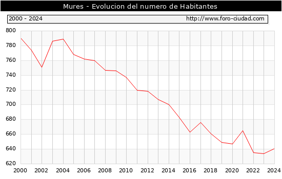 Segun los datos publicados por el INE a 1 de Enero de 2024 el numero de habitantes en Mures era de 641, 7 habitantes mas que el en el año 2023. En el grafico siguiente se puede ver cuantos habitantes tiene Mures a lo largo de los años.