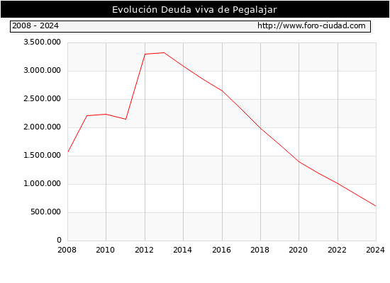 Pegalajar - Deuda viva del Ayuntamiento a 31/12/2024 Pegalajar - Deuda viva del Ayuntamiento a 31/12/2024 Segun el Ministerio de Economia y Hacienda el Ayuntamiento de Pegalajar a 31/12/2024 posee una deuda de 609.000 € . La deuda viva a 31/12/2023 ascendia a 814.000 € por lo que en el ultimo año la deuda se redujo en -205.000 €. ![]()