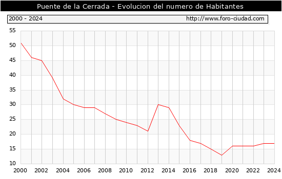 el numero de habitantes en Puente de la Cerrada era de 17, igual numero de habitantes que el en el año 2023. En el grafico siguiente se puede ver cuantos habitantes tiene Puente de la Cerrada a lo largo de los años.