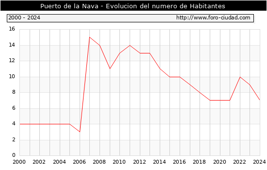 el numero de habitantes en Puerto de la Nava era de 7, 2 habitantes menos que el en el año 2023. En el grafico siguiente se puede ver cuantos habitantes tiene Puerto de la Nava a lo largo de los años.