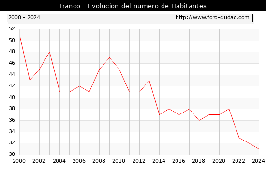 el numero de habitantes en Tranco era de 31, 1 habitantes menos que el en el año 2023. En el grafico siguiente se puede ver cuantos habitantes tiene Tranco a lo largo de los años.