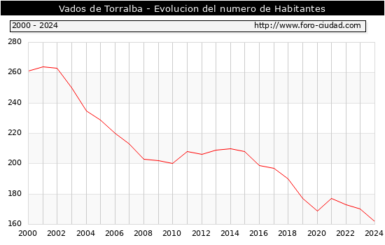 el numero de habitantes en Vados de Torralba era de 162, 8 habitantes menos que el en el año 2023. En el grafico siguiente se puede ver cuantos habitantes tiene Vados de Torralba a lo largo de los años.