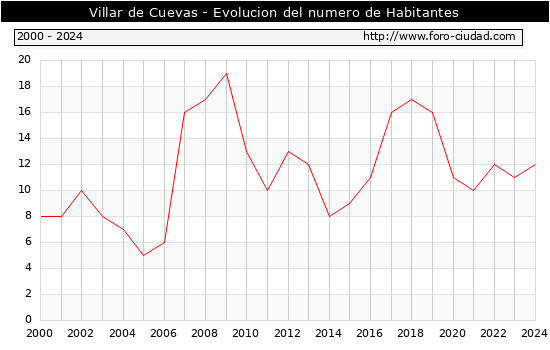 el numero de habitantes en Villar de Cuevas era de 12, 1 habitantes mas que el en el año 2023. En el grafico siguiente se puede ver cuantos habitantes tiene Villar de Cuevas a lo largo de los años.