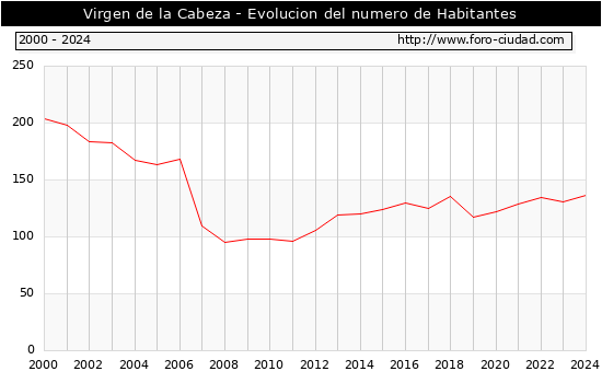 el numero de habitantes en Virgen de la Cabeza era de 137, 6 habitantes mas que el en el año 2023. En el grafico siguiente se puede ver cuantos habitantes tiene Virgen de la Cabeza a lo largo de los años.