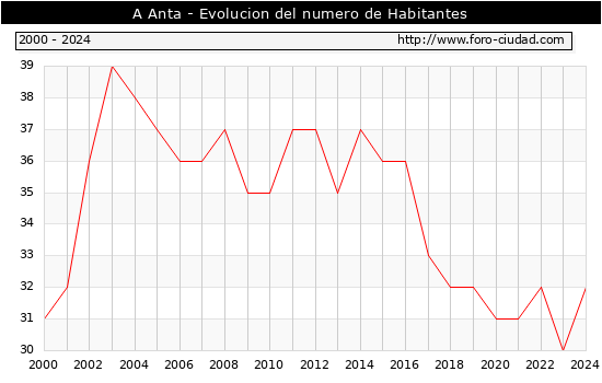 Segun los datos publicados por el INE a 1 de Enero de 2024 el numero de habitantes en A Anta era de 32, 2 habitantes mas que el en el año 2023. En el grafico siguiente se puede ver cuantos habitantes tiene A Anta a lo largo de los años.