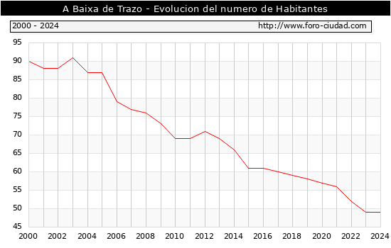 el numero de habitantes en A Baixa de Trazo era de 49, igual numero de habitantes que el en el año 2023. En el grafico siguiente se puede ver cuantos habitantes tiene A Baixa de Trazo a lo largo de los años.