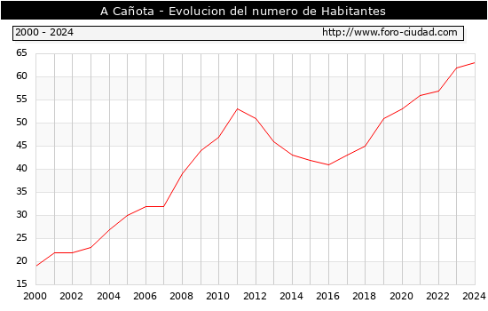 el numero de habitantes en A Cañota era de 63, 1 habitantes mas que el en el año 2023. En el grafico siguiente se puede ver cuantos habitantes tiene A Cañota a lo largo de los años.