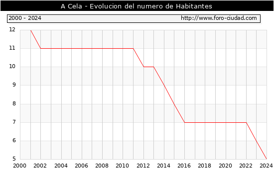 Segun los datos publicados por el INE a 1 de Enero de 2024 el numero de habitantes en A Cela era de 5, 1 habitantes menos que el en el año 2023. En el grafico siguiente se puede ver cuantos habitantes tiene A Cela a lo largo de los años.
