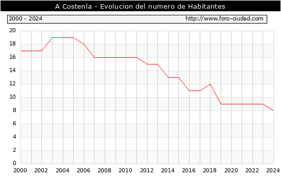 el numero de habitantes en A Costenla era de 8, 1 habitantes menos que el en el año 2023. En el grafico siguiente se puede ver cuantos habitantes tiene A Costenla a lo largo de los años.