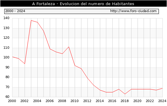 el numero de habitantes en A Fortaleza era de 69, 2 habitantes mas que el en el año 2023. En el grafico siguiente se puede ver cuantos habitantes tiene A Fortaleza a lo largo de los años.
