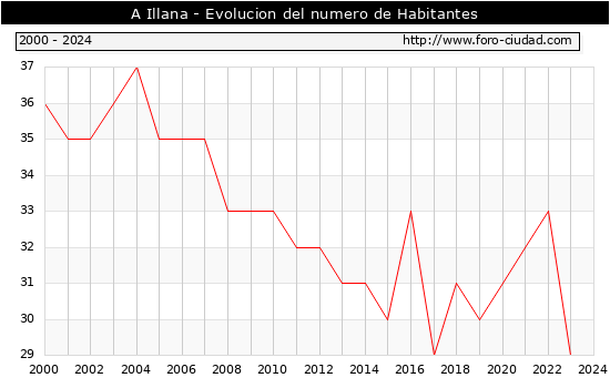 el numero de habitantes en A Illana era de 29, igual numero de habitantes que el en el año 2023. En el grafico siguiente se puede ver cuantos habitantes tiene A Illana a lo largo de los años.