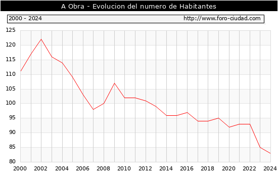 el numero de habitantes en A Obra era de 83, 2 habitantes menos que el en el año 2023. En el grafico siguiente se puede ver cuantos habitantes tiene A Obra a lo largo de los años.