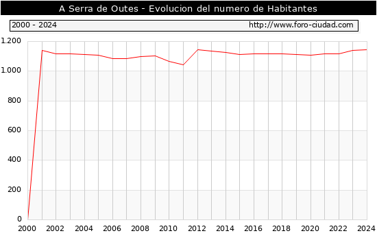 el numero de habitantes en A Serra de Outes era de 1.143, 4 habitantes mas que el en el año 2023. En el grafico siguiente se puede ver cuantos habitantes tiene A Serra de Outes a lo largo de los años.