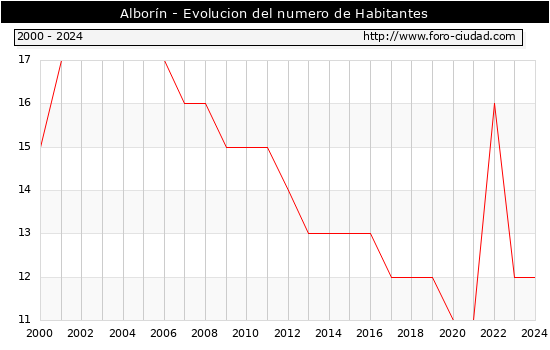 el numero de habitantes en Alborín era de 12, igual numero de habitantes que el en el año 2023. En el grafico siguiente se puede ver cuantos habitantes tiene Alborín a lo largo de los años.
