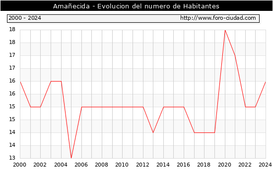 el numero de habitantes en Amañecida era de 16, 1 habitantes mas que el en el año 2023. En el grafico siguiente se puede ver cuantos habitantes tiene Amañecida a lo largo de los años.