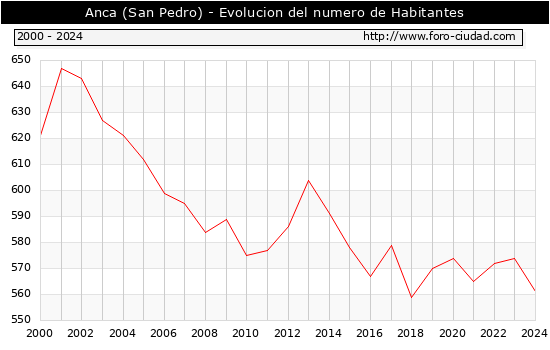 Segun los datos publicados por el INE a 1 de Enero de 2024 el numero de habitantes en Anca (San Pedro) era de 561, 13 habitantes menos que el en el año 2023. En el grafico siguiente se puede ver cuantos habitantes tiene Anca (San Pedro) a lo largo de los años.