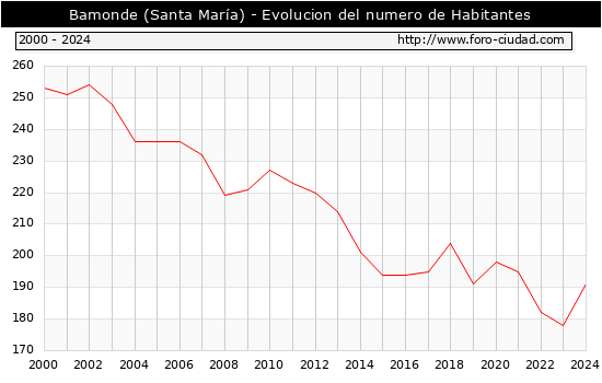 el numero de habitantes en Bamonde (Santa María) era de 191, 13 habitantes mas que el en el año 2023. En el grafico siguiente se puede ver cuantos habitantes tiene Bamonde (Santa María) a lo largo de los años.