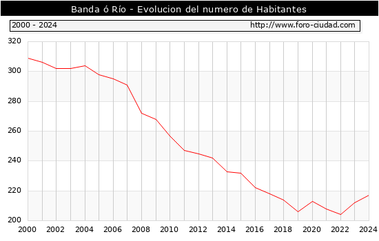 el numero de habitantes en Banda ó Río era de 217, 5 habitantes mas que el en el año 2023. En el grafico siguiente se puede ver cuantos habitantes tiene Banda ó Río a lo largo de los años.