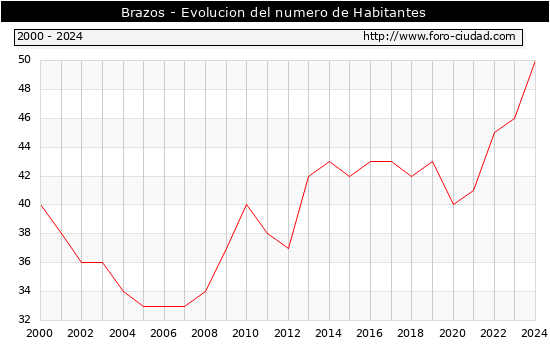 el numero de habitantes en Brazos era de 50, 4 habitantes mas que el en el año 2023. En el grafico siguiente se puede ver cuantos habitantes tiene Brazos a lo largo de los años.