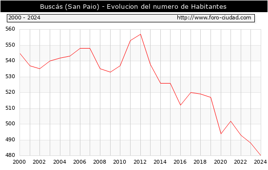 el numero de habitantes en Buscás (San Paio) era de 480, 8 habitantes menos que el en el año 2023. En el grafico siguiente se puede ver cuantos habitantes tiene Buscás (San Paio) a lo largo de los años.