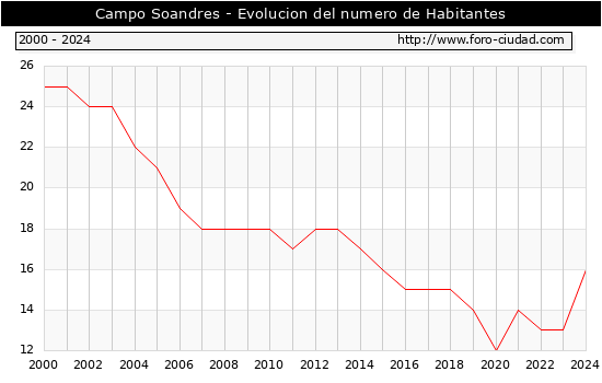 el numero de habitantes en Campo Soandres era de 16, 3 habitantes mas que el en el año 2023. En el grafico siguiente se puede ver cuantos habitantes tiene Campo Soandres a lo largo de los años.