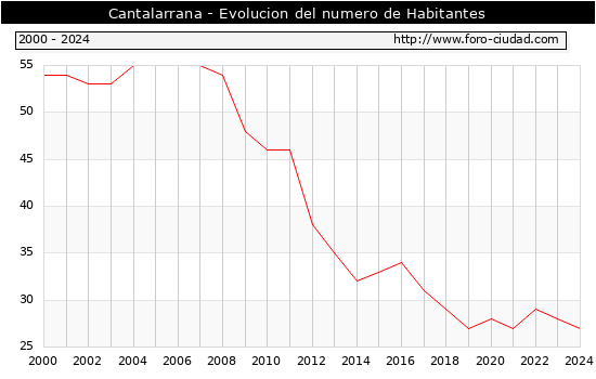 el numero de habitantes en Cantalarrana era de 27, 1 habitantes menos que el en el año 2023. En el grafico siguiente se puede ver cuantos habitantes tiene Cantalarrana a lo largo de los años.