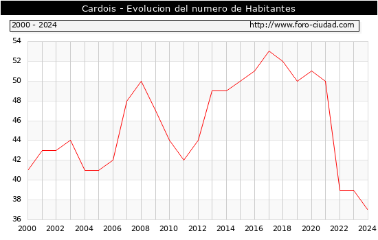 el numero de habitantes en Cardois era de 37, 2 habitantes menos que el en el año 2023. En el grafico siguiente se puede ver cuantos habitantes tiene Cardois a lo largo de los años.