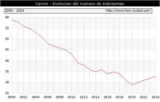 el numero de habitantes en Carnio era de 33, 1 habitantes mas que el en el año 2023. En el grafico siguiente se puede ver cuantos habitantes tiene Carnio a lo largo de los años.