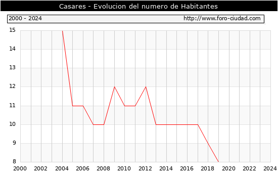 el numero de habitantes en Casares era de 8, igual numero de habitantes que el en el año 2023. En el grafico siguiente se puede ver cuantos habitantes tiene Casares a lo largo de los años.