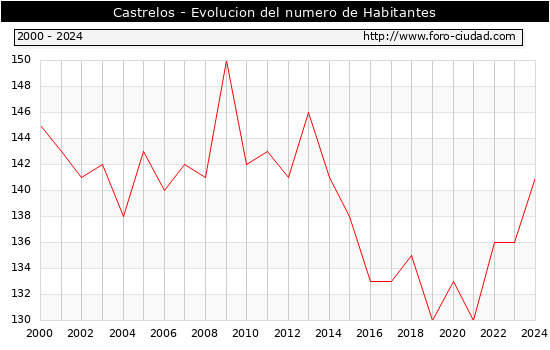 Segun los datos publicados por el INE a 1 de Enero de 2024 el numero de habitantes en Castrelos era de 141, 5 habitantes mas que el en el año 2023. En el grafico siguiente se puede ver cuantos habitantes tiene Castrelos a lo largo de los años.