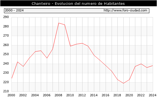 el numero de habitantes en Chanteiro era de 238, 2 habitantes mas que el en el año 2023. En el grafico siguiente se puede ver cuantos habitantes tiene Chanteiro a lo largo de los años.