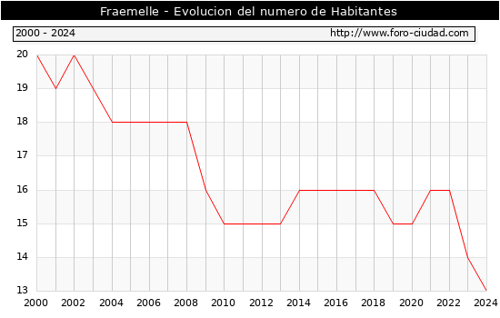 el numero de habitantes en Fraemelle era de 13, 1 habitantes menos que el en el año 2023. En el grafico siguiente se puede ver cuantos habitantes tiene Fraemelle a lo largo de los años.