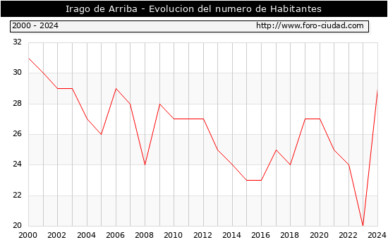 el numero de habitantes en Irago de Arriba era de 29, 9 habitantes mas que el en el año 2023. En el grafico siguiente se puede ver cuantos habitantes tiene Irago de Arriba a lo largo de los años.