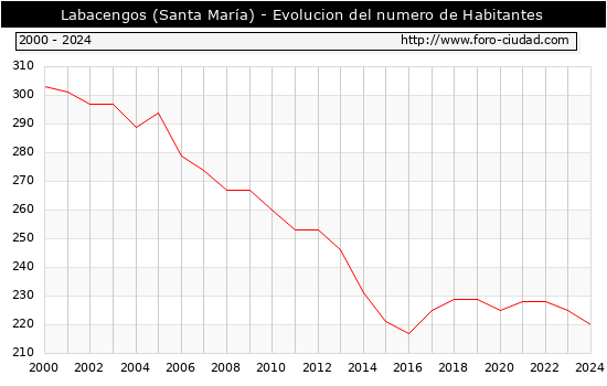 el numero de habitantes en Labacengos (Santa María) era de 220, 5 habitantes menos que el en el año 2023. En el grafico siguiente se puede ver cuantos habitantes tiene Labacengos (Santa María) a lo largo de los años.