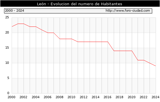 el numero de habitantes en León era de 9, 1 habitantes menos que el en el año 2023. En el grafico siguiente se puede ver cuantos habitantes tiene León a lo largo de los años.