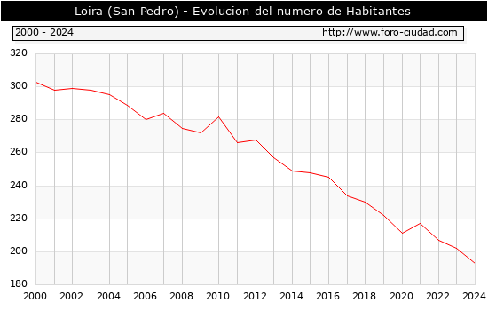 el numero de habitantes en Loira (San Pedro) era de 193, 9 habitantes menos que el en el año 2023. En el grafico siguiente se puede ver cuantos habitantes tiene Loira (San Pedro) a lo largo de los años.