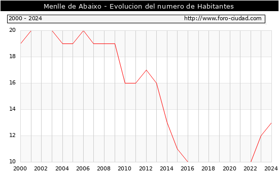 el numero de habitantes en Menlle de Abaixo era de 13, 1 habitantes mas que el en el año 2023. En el grafico siguiente se puede ver cuantos habitantes tiene Menlle de Abaixo a lo largo de los años.