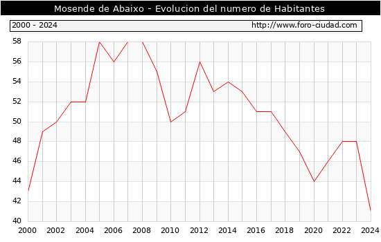 el numero de habitantes en Mosende de Abaixo era de 41, 7 habitantes menos que el en el año 2023. En el grafico siguiente se puede ver cuantos habitantes tiene Mosende de Abaixo a lo largo de los años.