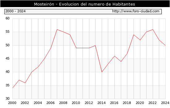 el numero de habitantes en Mosteirón era de 50, 2 habitantes menos que el en el año 2023. En el grafico siguiente se puede ver cuantos habitantes tiene Mosteirón a lo largo de los años.