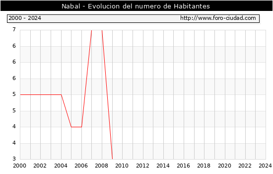 el numero de habitantes en Nabal era de 3, igual numero de habitantes que el en el año 2023. En el grafico siguiente se puede ver cuantos habitantes tiene Nabal a lo largo de los años.