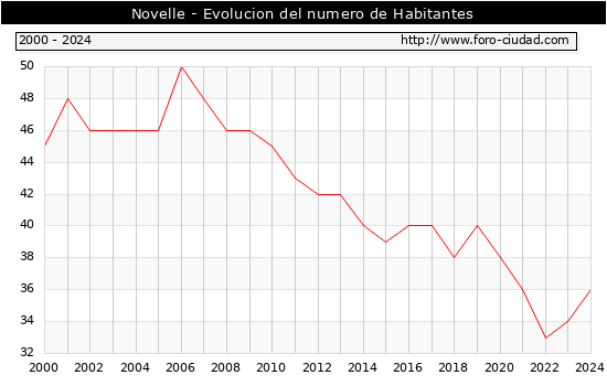 el numero de habitantes en Novelle era de 36, 2 habitantes mas que el en el año 2023. En el grafico siguiente se puede ver cuantos habitantes tiene Novelle a lo largo de los años.