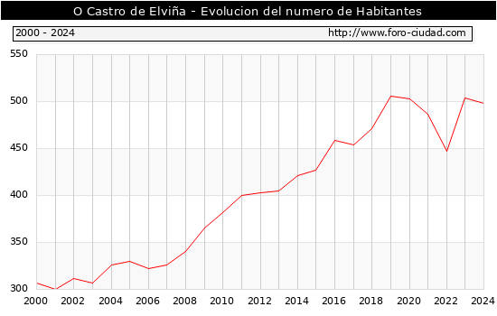 el numero de habitantes en O Castro de Elviña era de 498, 6 habitantes menos que el en el año 2023. En el grafico siguiente se puede ver cuantos habitantes tiene O Castro de Elviña a lo largo de los años.