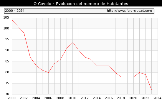 el numero de habitantes en O Covelo era de 72, igual numero de habitantes que el en el año 2023. En el grafico siguiente se puede ver cuantos habitantes tiene O Covelo a lo largo de los años.