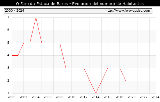 el numero de habitantes en O Faro da Estaca de Bares era de 2, igual numero de habitantes que el en el año 2023. En el grafico siguiente se puede ver cuantos habitantes tiene O Faro da Estaca de Bares a lo largo de los años.