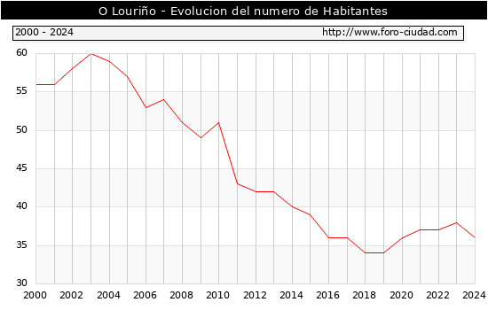 el numero de habitantes en O Louriño era de 36, 2 habitantes menos que el en el año 2023. En el grafico siguiente se puede ver cuantos habitantes tiene O Louriño a lo largo de los años.